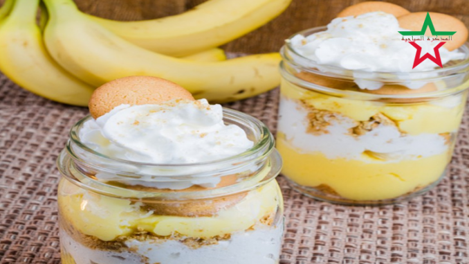 6. ضعي طبقة من البسكويت في أكواب التقديم ثم طبقة من الحشوة وشرائح الموز ثم طبقة كريمة.